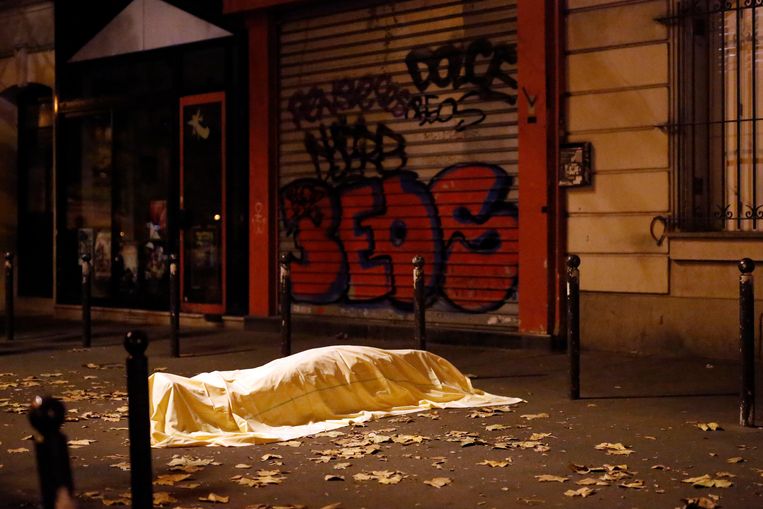 Forensische experts doen onderzoek bij bataclan bron. Op het ogenblik dat de eerste politiemensen de zaal binnenkomen is zichtbaar hoe ze bezaaid ligt. In de zaal waar 1500 mensen in kunnen zijn volgens de laatste cijfers 87 personen om het leven gekomen.
