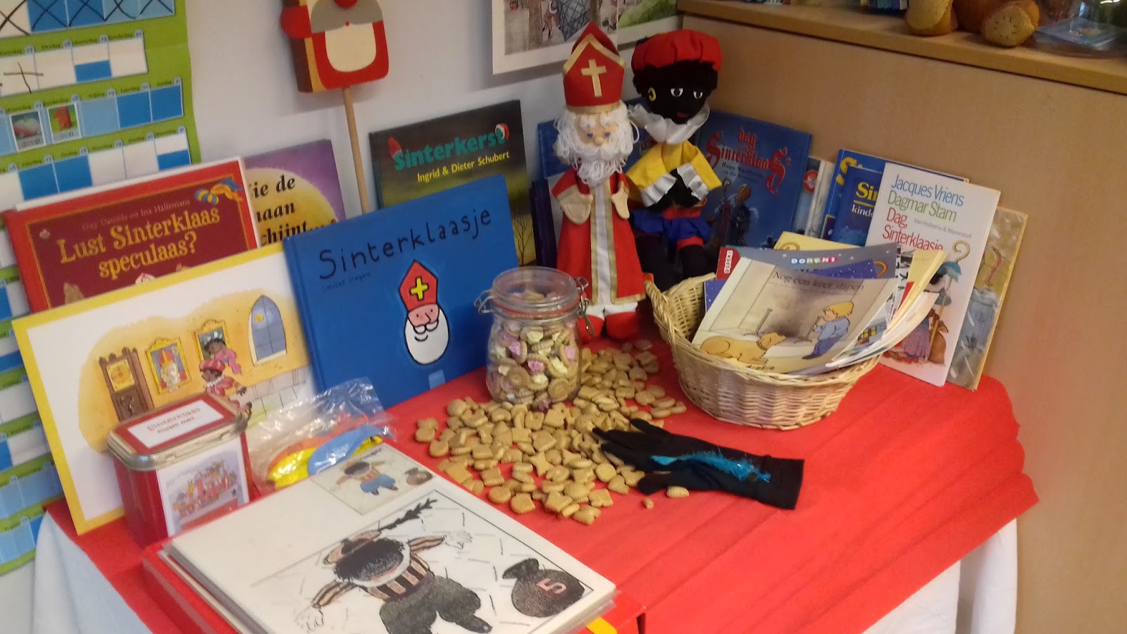 1 poster van sinterklaas en piet op het dak. Et al bundel met verhalen liedjes recepten informatie over en een interview met sinterklaas. Jij kan hem helpen.