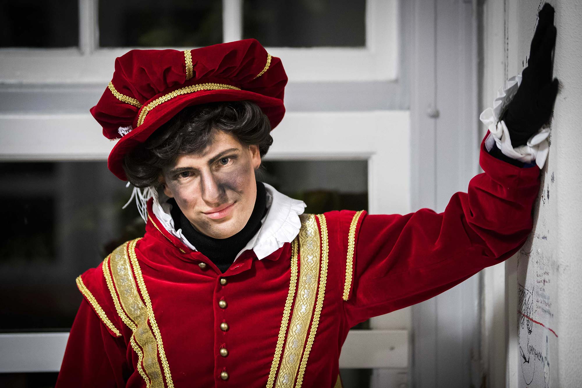 In dutch tradition sinterklaas has a helper named zwarte piet or black pete who usually appears as a blackface character with large gold earrings and exaggerated lips.
