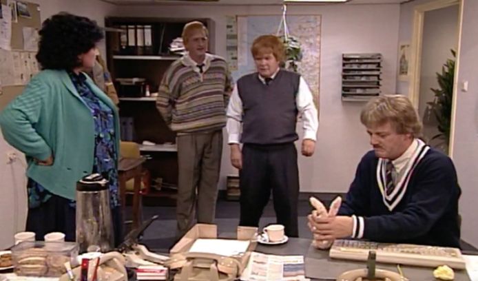 Bob de rooij als sinterklaas. The funniest episode is when sinterklaas the dutch version of santa clause visits the office. The makers of jiskefet build this show from a gag they had in their already running satirical show about four people at an office.